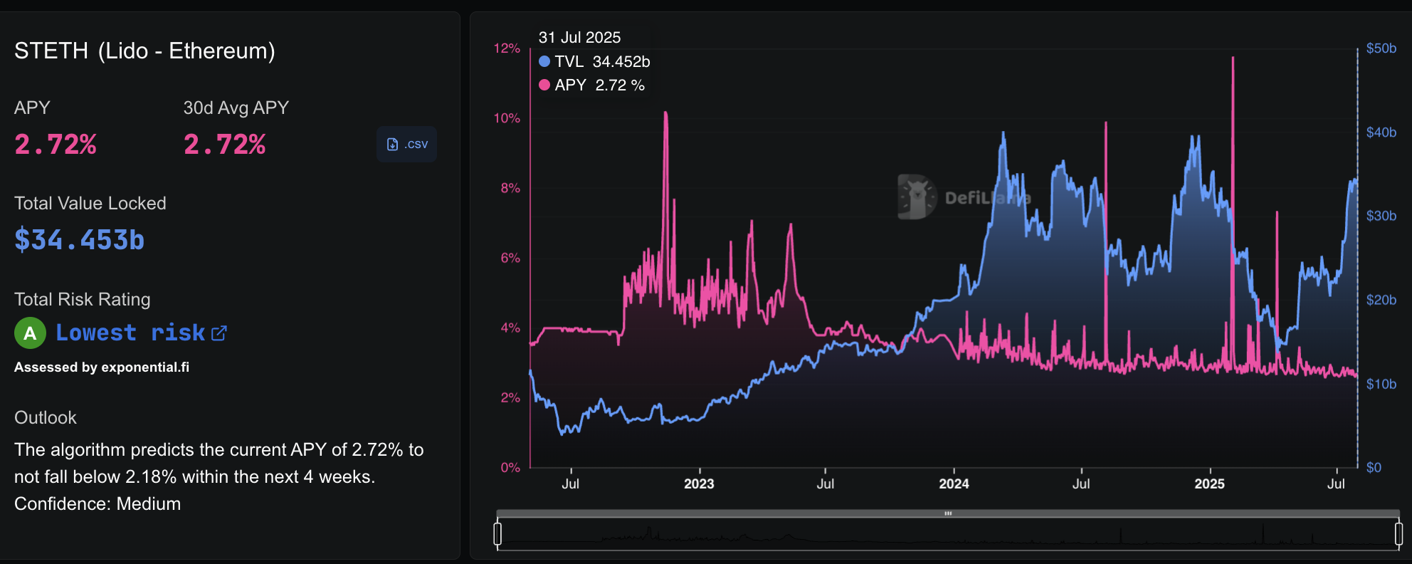 Eslatma: Staking depozitlari oshgan bo’lsa-da, «Lido» kabi platformalardagi individual daromadlar vaqt o’tishi bilan pasaygan. 2022-yil noyabr oyida «Lido»ning staking yillik foiz daromadi (APY) taxminan 8.16% edi, bugungi kunda esa taxminan 2.7% ni tashkil etadi, rekord darajadagi umumiy qiymat qulflangan (TVL) bo’lishiga qaramay. Shunga qaramay, ko’plab o’yinchilar uchun 30 kunlik yillik foiz daromadi (APY) egri chizig’i yashil rangda qolmoqda.