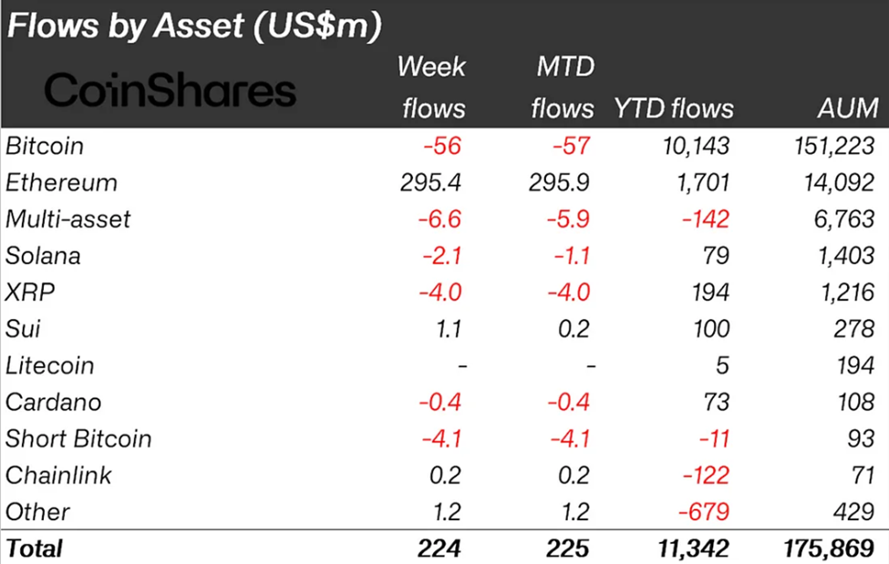 «CoinShares» kompaniyasining so’nggi hisobotiga ko’ra, kriptovalyuta oqimlari o’tgan hafta $224 millionga ko’tarildi. Shu bilan birga, Efirium (ETH) institutsional hissiyotda yetakchi o’rnini mustahkamlashda davom etmoqda.