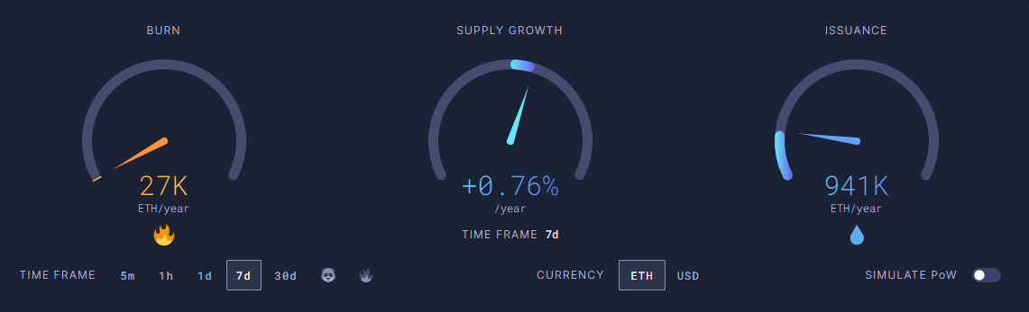 Biroq, so’nggi ma’lumotlar shuni ko’rsatadiki, Ethereum PoSga o’tishidan beri eng uzoq inflyatsion davrni boshdan kechirmoqda. Ultrasound Money ma’lumotlariga ko’ra, Ethereumning yillik inflyatsiya darajasi hozirda 0.76%. Ushbu yozuv paytida, tarmoq har yili 943,000 ETH chiqaradi, lekin faqat 27,000 ETHni yoqadi.
