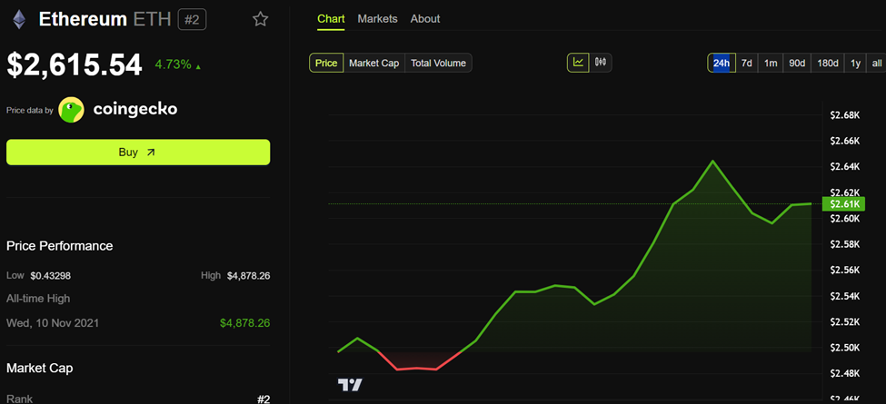 «BeInCrypto» ma’lumotlariga ko’ra, Efirium (ETH) hozirda $2,615 ga savdo qilinmoqda. So’nggi 24 soat ichida narx qariyb 5% ga oshgan.