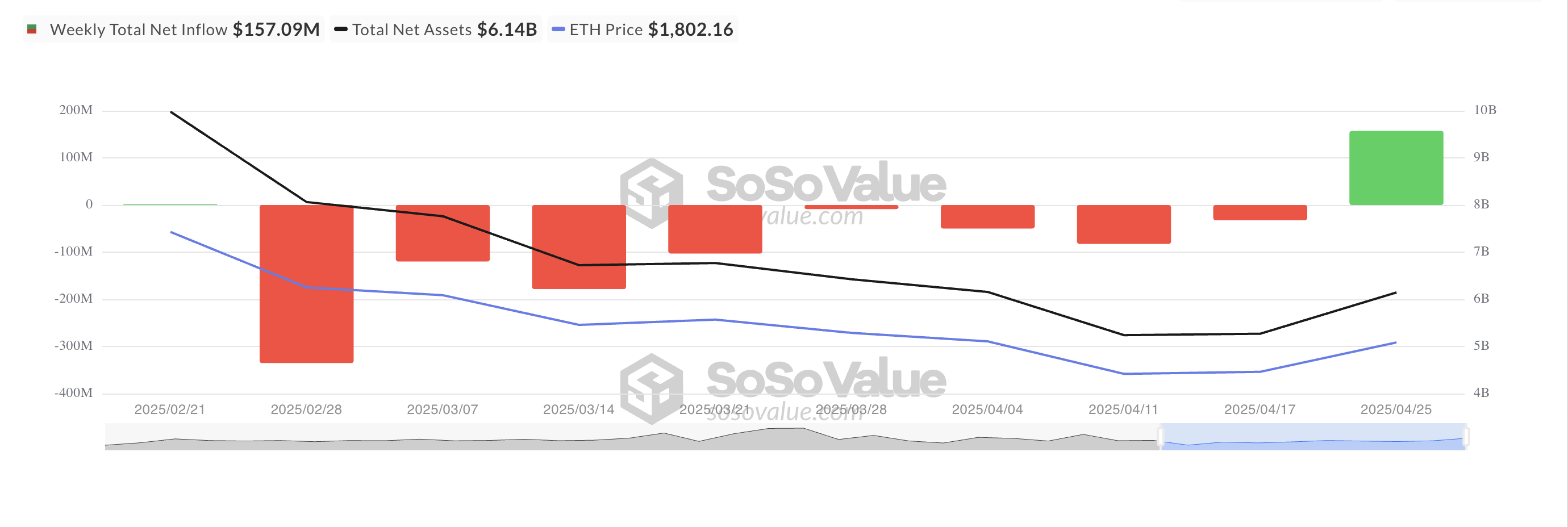 Bozordagi ijobiy narrativni qo’shib, Efirium asosidagi ETFlar sakkiz haftadan so’ng birinchi marta haftalik sof kirimni qayd etdi. «SosoValue» tashkilotiga ko’ra, Efirium asosidagi ETFlarga kirimlar 21-apreldan 25-aprelgacha $157.09 millionni tashkil etdi. Bu sakkiz haftalik $700 milliondan ortiq chiqimlar seriyasini teskari o’zgartirdi.