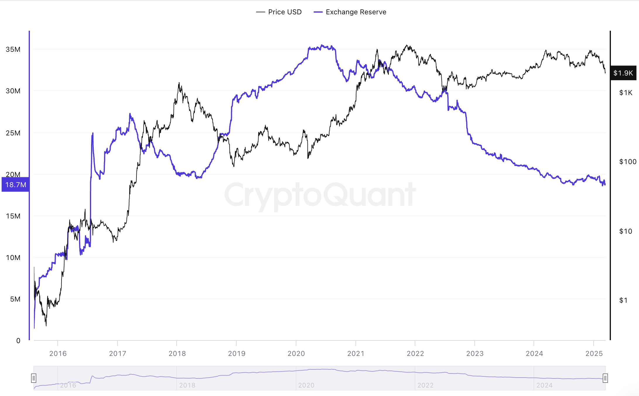 Narx harakatidan tashqari, Ethereumning birjalardagi ta’minoti ham sotish bosimining kamayishini ko’rsatadi. Ethereumning birja zaxiralari yillar davomida eng past darajaga tushib ketdi, bu esa kamroq egalarning o’z aktivlarini sotishga tayyorligini ko’rsatadi.