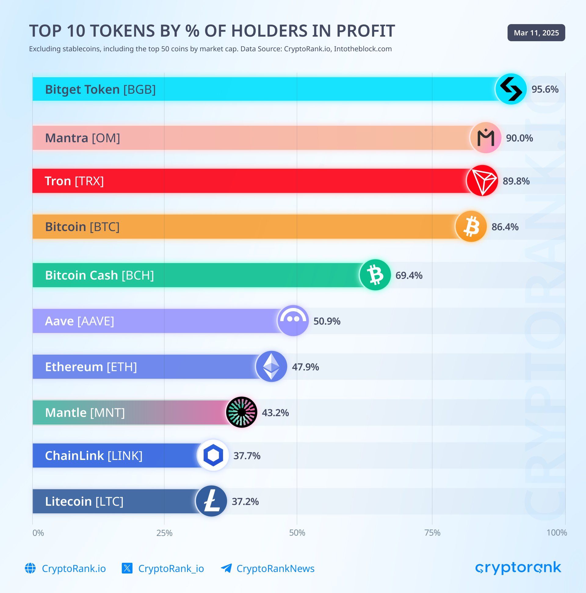 Bunga qarama-qarshi ravishda, Bitcoin (BTC) egalari orasida 86% foydada, bu esa Ethereumga nisbatan nisbatan barqarorligini ko’rsatadi. Shu bilan birga, Bitget Token (BGB) 95% egalari foydada bo’lgan holda yetakchilik qilmoqda.