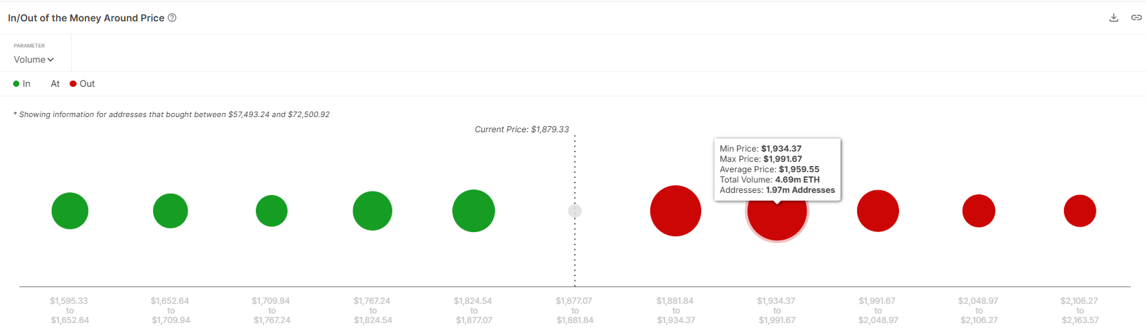 IOMAP (Narx atrofida foyda/zarar) indikatori hozirda taxminan 9.69 million ETH, 18 milliard dollarga baholangan, foyda va zarar o’rtasida o’zgarib turishini ko’rsatadi. Ushbu muhim ta’minot, $1,880 va $2,048 oralig’ida sotib olingan, o’tgan oyda cheklangan harakatni ko’rdi. Agar Ethereum $2,000 qarshiligini buzib qo’llab-quvvatlashga aylantira olsa, bu katta ta’minot foydaga o’tadi.