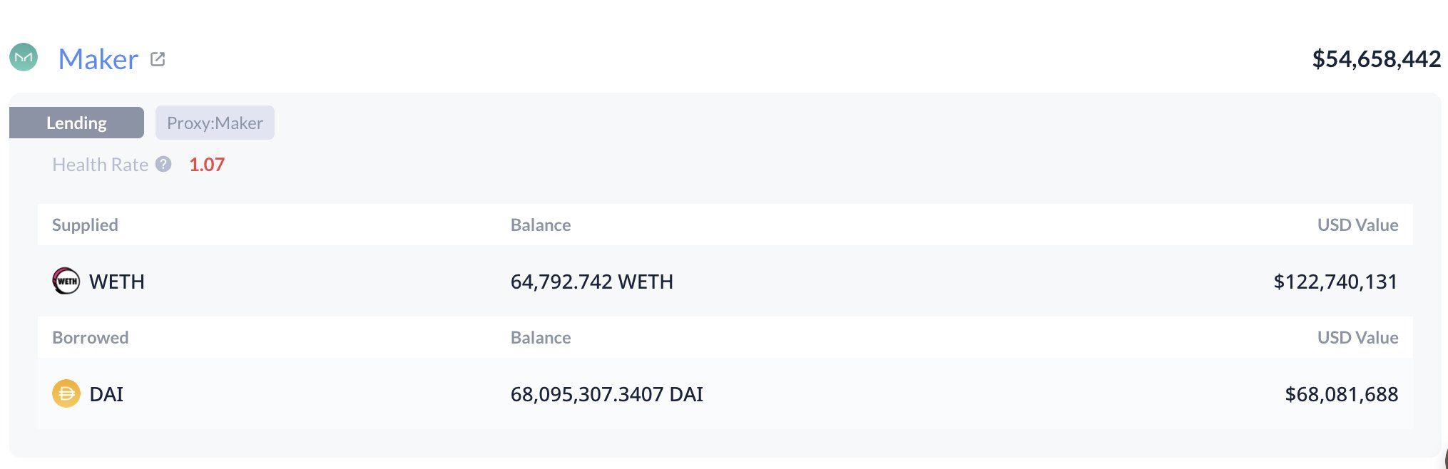 Maker tizimida foydalanuvchilar DAI stablecoinini qarz olish uchun omborlarga ETHni garov sifatida qo’yishlari mumkin. Likvidatsiyadan qochish uchun garov ma’lum bir sog’liq nisbatidan yuqori bo’lishi kerak — asosan xavfsizlik buferi.