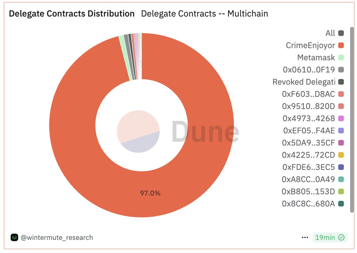 “Wintermute” kripto savdo kompaniyasining tahlilchilari, hujumchilar EIP-7702 hamyon delegatsiyalarining 97% dan foydalanib, foydalanuvchilarning mablag’larini o’g’irlash uchun mo’ljallangan shartnomalarni joylashtirganliklarini ta’kidladilar.