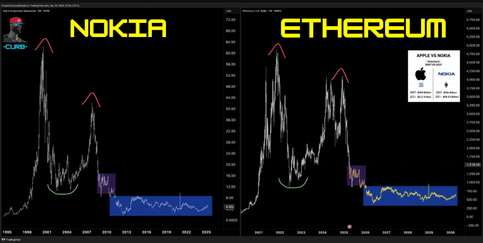 Tahlilchi ikki grafikni taqdim etdi: 2007-yildagi cho’qqidan keyin Nokia aksiyalarining pasayishi va 2021-yildagi yuqori nuqtadan keyin Ethereumning bozor qiymatining pasayishi.
