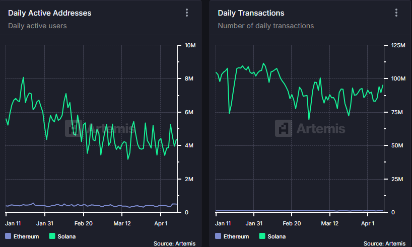 On-chain ma’lumotlariga ko’ra, Solana bir nechta muhim ko’rsatkichlar bo’yicha Ethereumdan ustun kelmoqda. Bular orasida kunlik faol manzillar va kunlik tranzaksiyalar bor, bu esa uni ishlab chiquvchilar va foydalanuvchilar uchun jozibador qiladi.