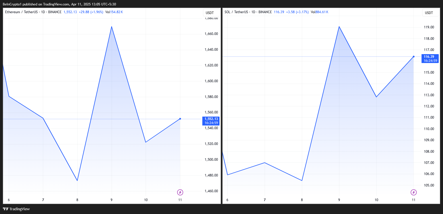 Ma’lumotlarga ko’ra, ushbu yozuv paytida ETH $1,552 ga savdo qilinmoqda, bu so’nggi 24 soatda 4% dan ko’proq pasayishni anglatadi. Shu bilan birga, Solana $116.39 ga savdo qilinmoqda va kun davomida 1.01% o’sishni qayd etdi.