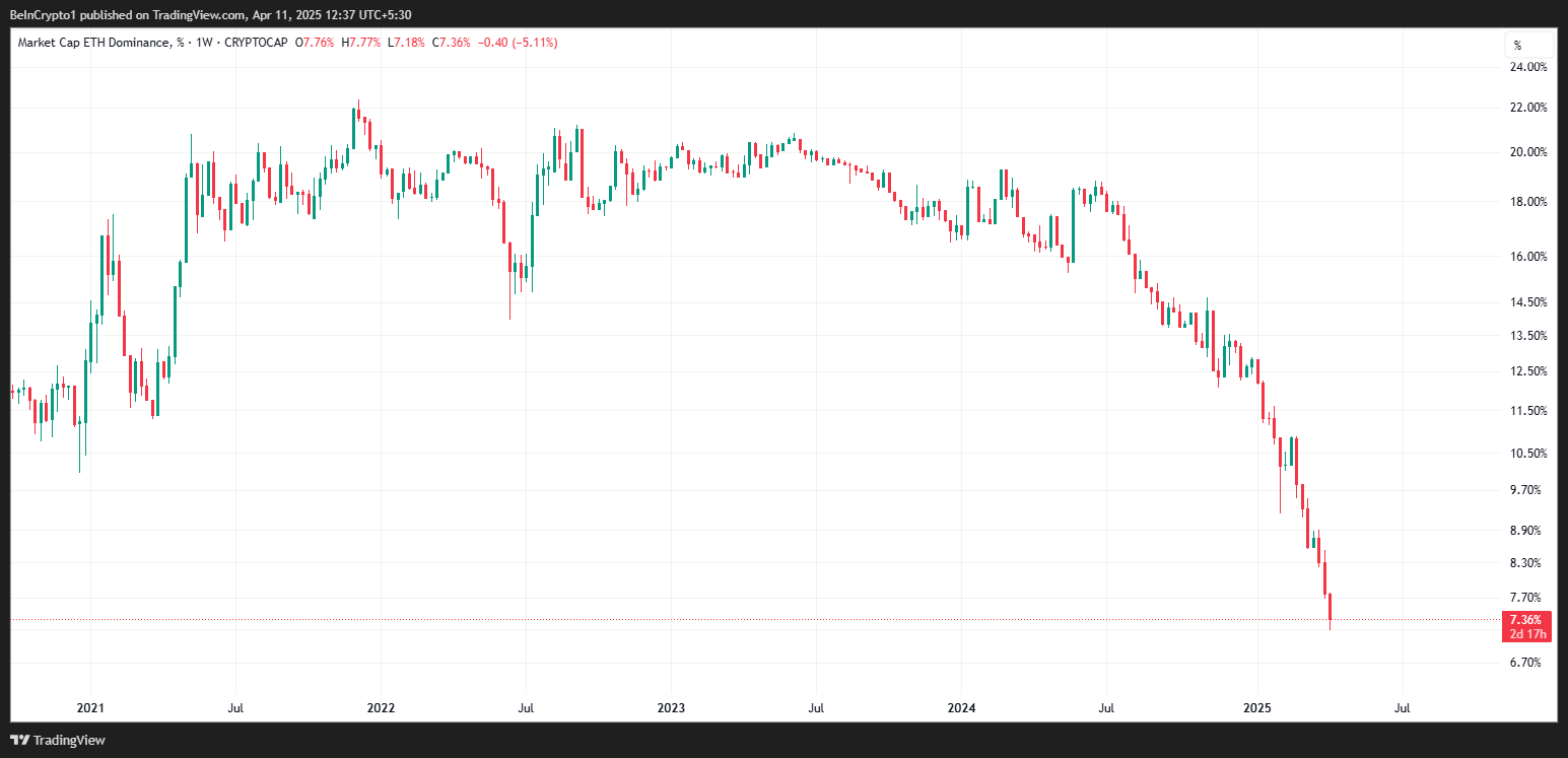 Bu orada, TradingView ma’lumotlariga ko’ra, Ethereum bir vaqtlar umumiy kripto bozorining 20% dan ortig’ini egallagan bo’lsa, hozirda bu ko’rsatkich 10% dan kam.
