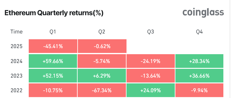 Ayni paytda, tarmoqning moliyaviy ko’rsatkichlari bu xavotirlarni aks ettiradi. ETH narxi 2025 yilning 1-choragida 45% dan ko’proq pasayib, 2022 yildan beri eng yomon chorak ko’rsatkichini qayd etdi.