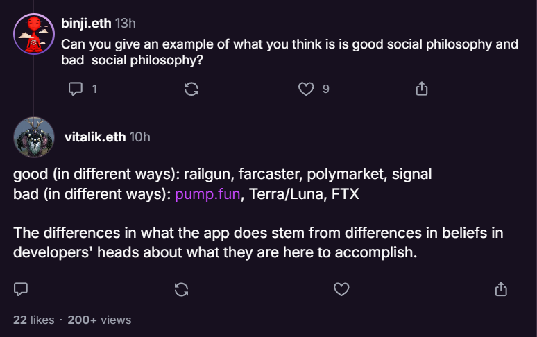 Ethereum asoschilaridan biri Vitalik Buterin, blokcheyn ilovalari ko’pincha ularning yaratuvchilarining niyatlari va axloqiy qarashlarini aks ettiradi, deb hisoblaydi. U Pump.fun kabi loyihalar yomon ijtimoiy falsafadan kelib chiqqanini ta’kidlaydi.