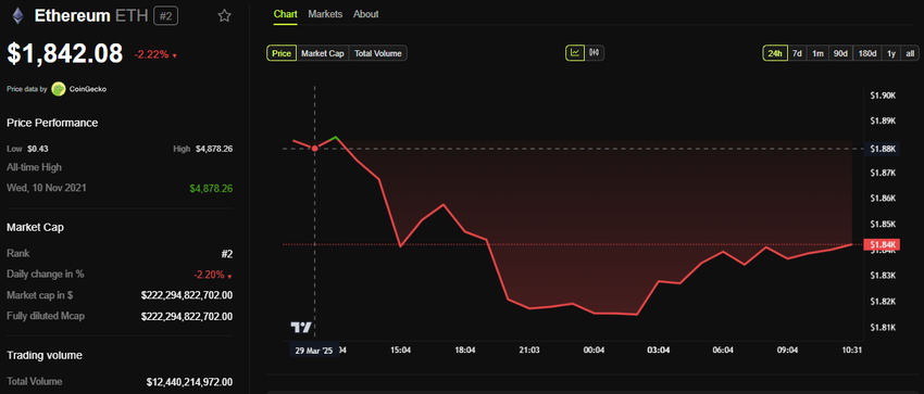 Jamoa optimizmiga qaramay, Ethereumning narxi so’nggi 24 soat ichida 2.22% ga pasaydi. BeInCrypto ma’lumotlariga ko’ra ushbu yozuv paytida ETH $1,842 ga savdo qilinmoqda.