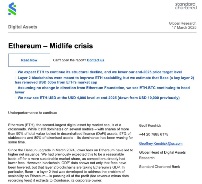 Standard Chartered tahlilchilari ham yil oxiridagi Ether narxi prognozini 60% ga qisqartirdilar, bu Ethereumning “identitet inqirozi” va kelajakdagi noaniq yo’nalishi bilan bog’liq ekanligini mijozlariga aytishdi.
