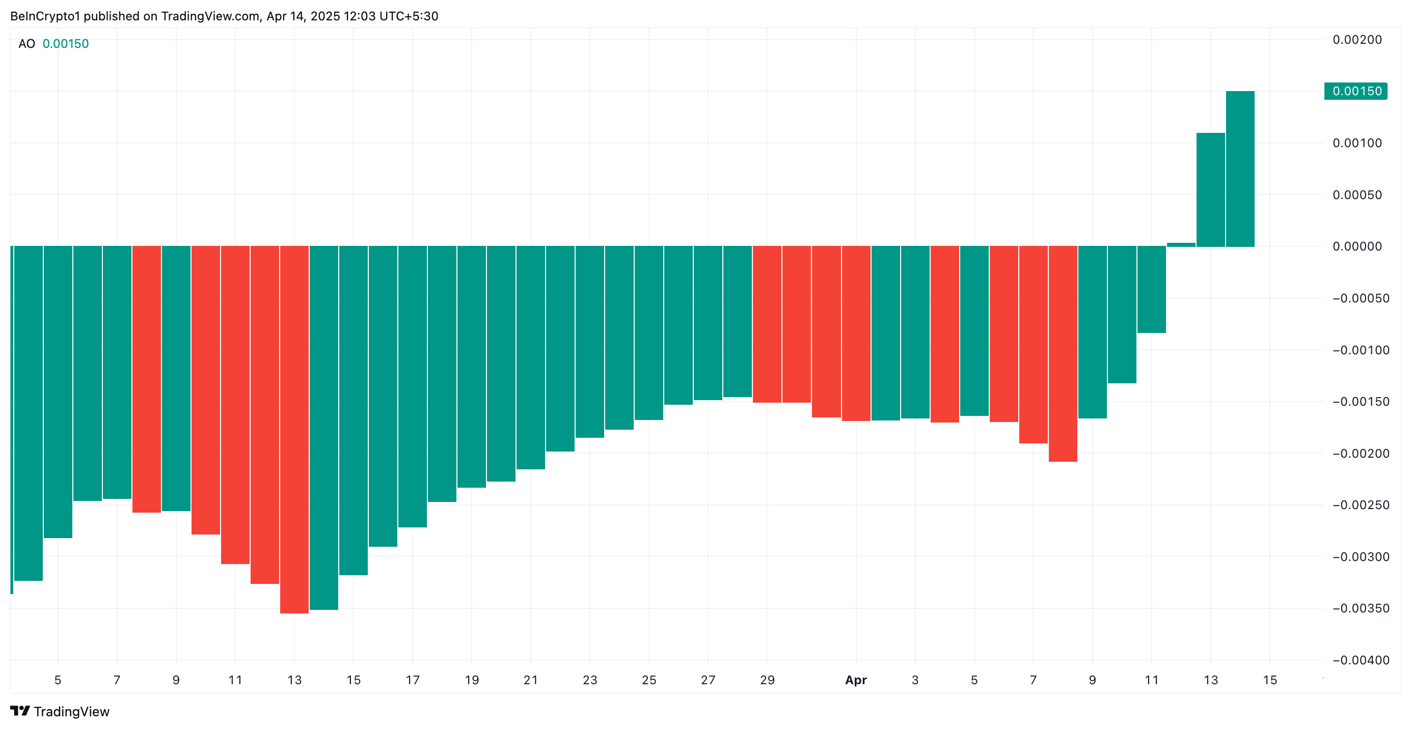 Boshqa tomondan, FLRda bo’lgani kabi, AO barlari nol chizig’idan yuqori bo’lib, yuqoriga ko’tarilishda davom etganda, bu yuksak momentum nafaqat mavjudligini, balki o’sib borayotganini bildiradi. Bu boshqa bozor sharoitlari mos kelsa, FLR uchun narxlarning yanada oshishiga ishora qiladi.