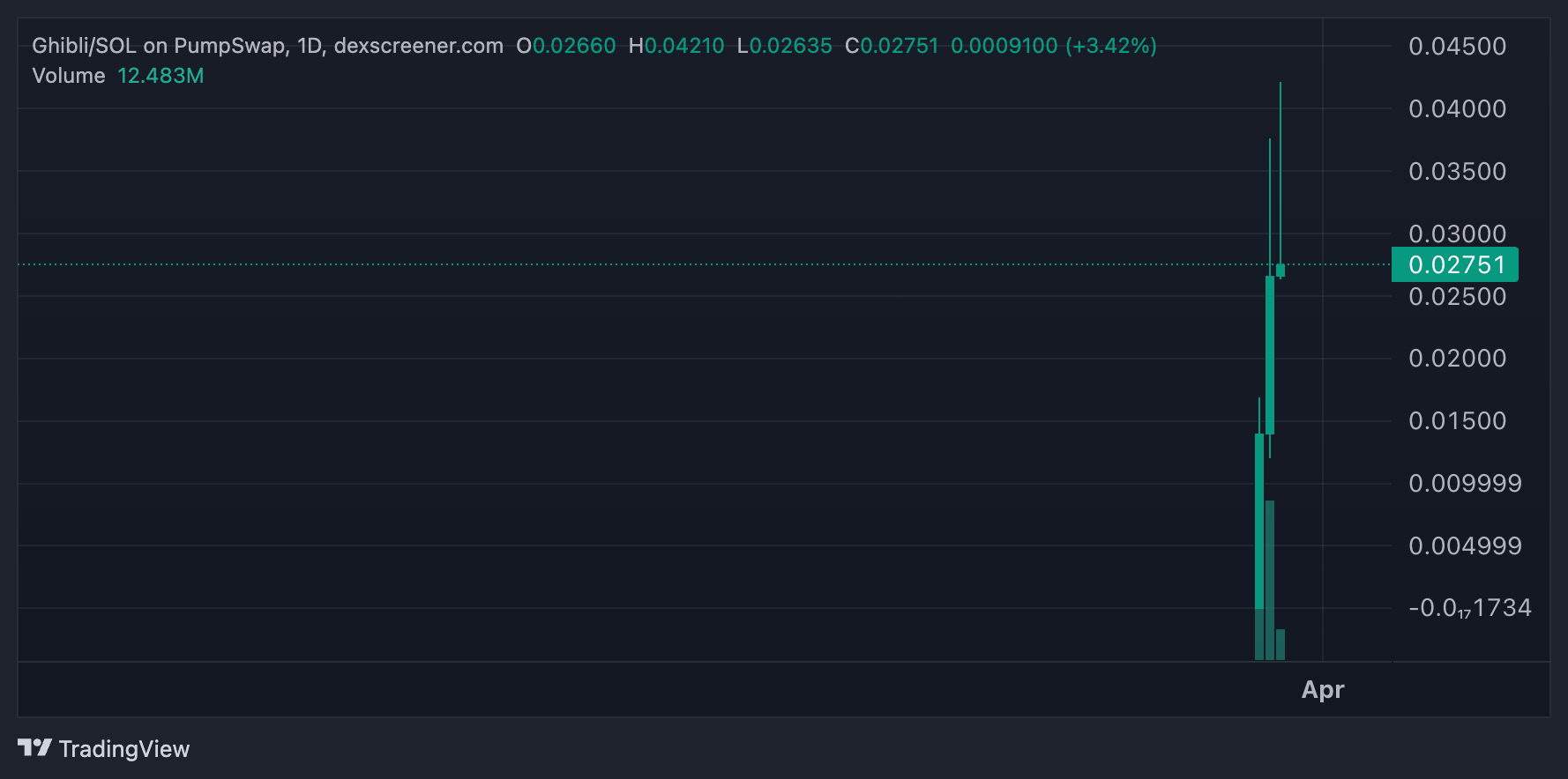 Ro’yxatga olishlar savdo faoliyatini kuchaytirdi. So’nggi ma’lumotlarga ko’ra, GHIBLI qiymati o’tgan kun davomida 44.4% ga oshdi. Matbuot vaqtida, meme tanga $0.027 da savdo qilindi, va uning bozor kapitalizatsiyasi $27.5 millionni tashkil etdi.
