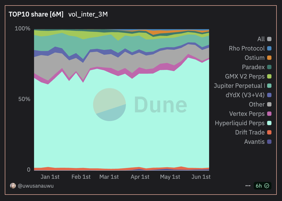 «Hyperliquid» o’zini kripto perpetuallar bozorida yetakchi kuch sifatida mustahkamladi, uning bozor ulushi 2024 yil dekabrida 63.7% dan bugungi kunda 76.9% gacha ko’tarildi.