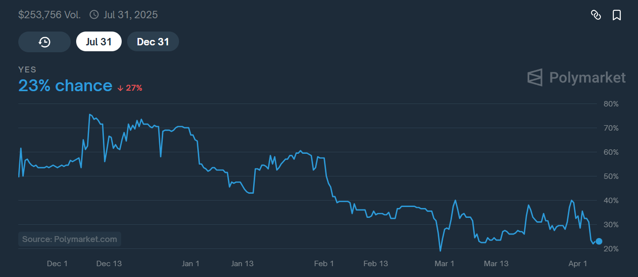 Polymarketda, 2025 yilning ikkinchi choragida Solana ETF tasdiqlanishi ehtimoli atigi 23% ni tashkil etadi. 2025 yil uchun umumiy tasdiqlash kutilmalari 83% ni tashkil etadi, bu yil boshida 92% edi.