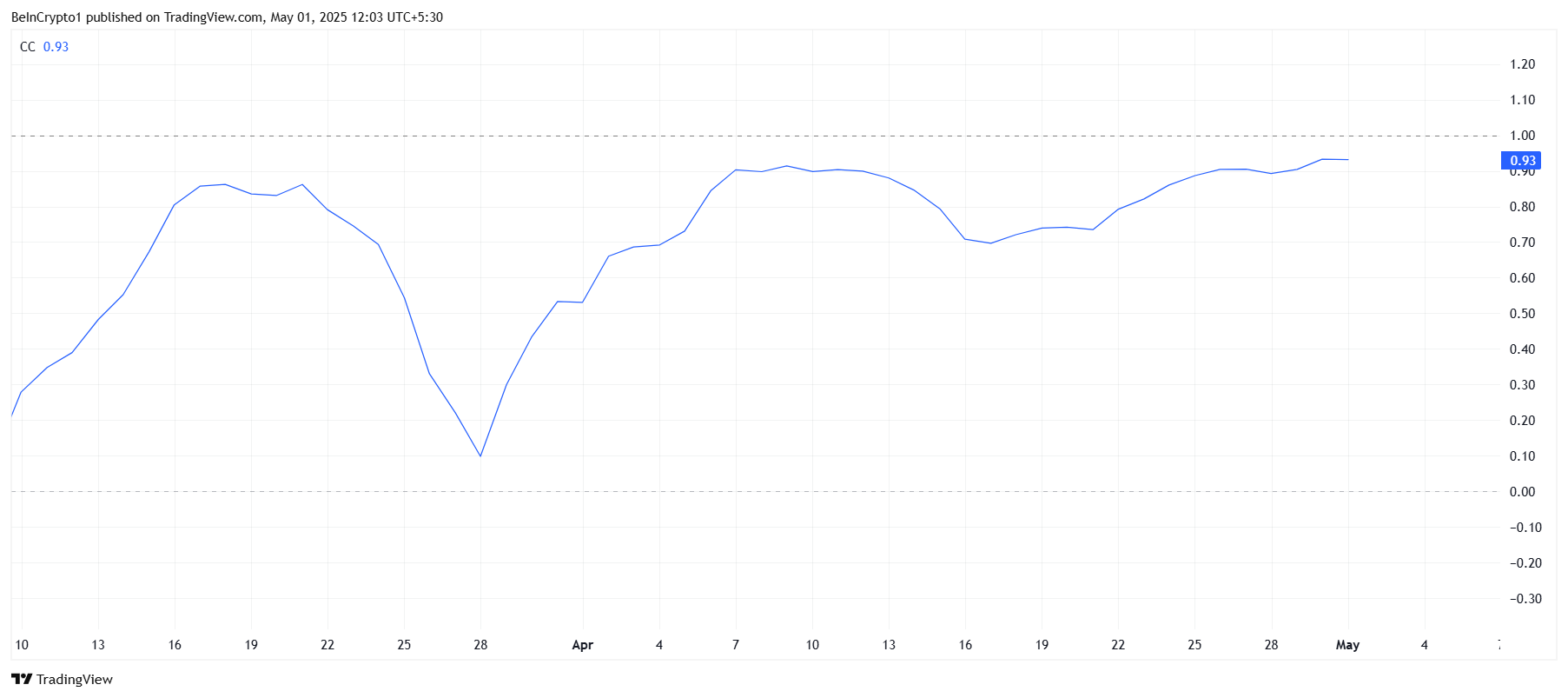 HBARning harakati Bitkoinning narx harakati bilan yaqin bog’liq ko’rinadi. Ikkalasi o’rtasidagi korrelyatsiya 0.93 ni tashkil etadi. Bitkoinning narxi $95,000 ga yaqinlashgani sari, HBAR ham o’sishi mumkin.