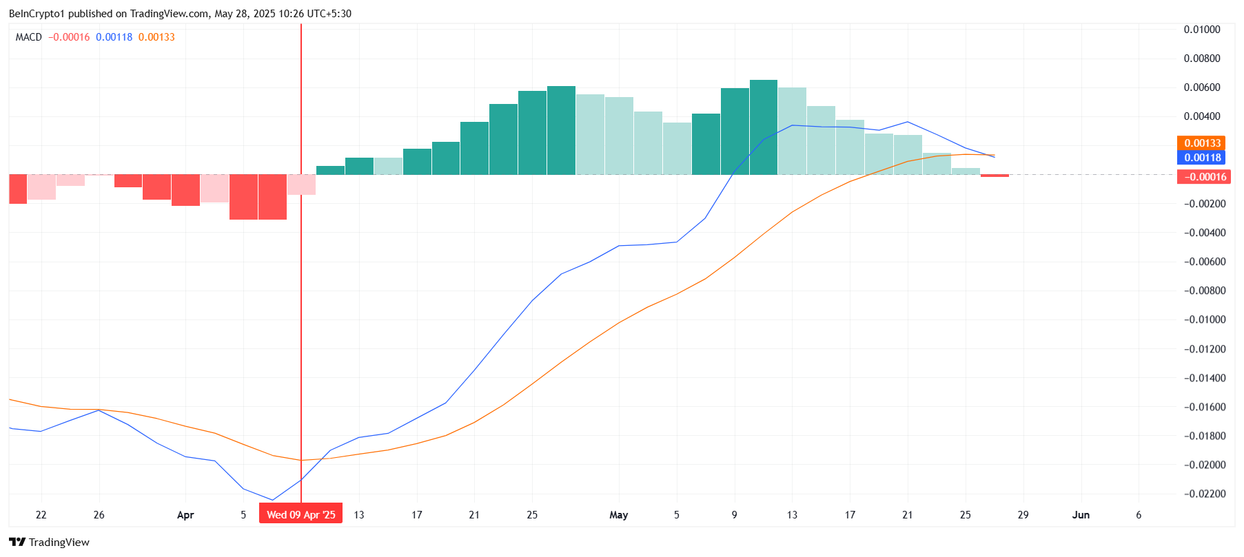 Kengroq harakatlanish kuchini tahlil qilganda, MACD indikatori hatto kichik pasayish ham jiddiy oqibatlarga olib kelishi mumkinligini ko’rsatadi. Likvidatsiya xaritasiga ko’ra, narx $0.172 ga tushsa, $55 milliondan ortiq likvidatsiyalarni keltirib chiqarishi mumkin. Bu katta sotuvni anglatadi va buqa bozorini to’xtatib, pasayishni tezlashtirishi mumkin.
