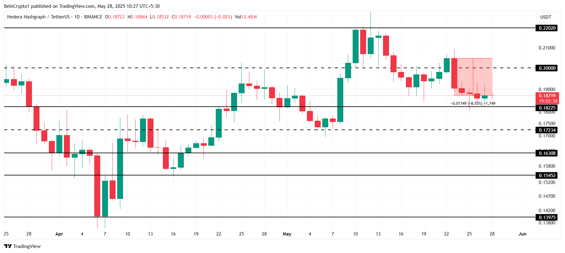 HBAR narxi o’tgan hafta davomida 8.5% ga pasaydi va hozirda $0.187 da savdo qilinmoqda. Token $0.182 darajasidagi darhol qo’llab-quvvatlashdan yuqorida qolayotgan bo’lsa-da, pasayish xavfi saqlanib qolmoqda.