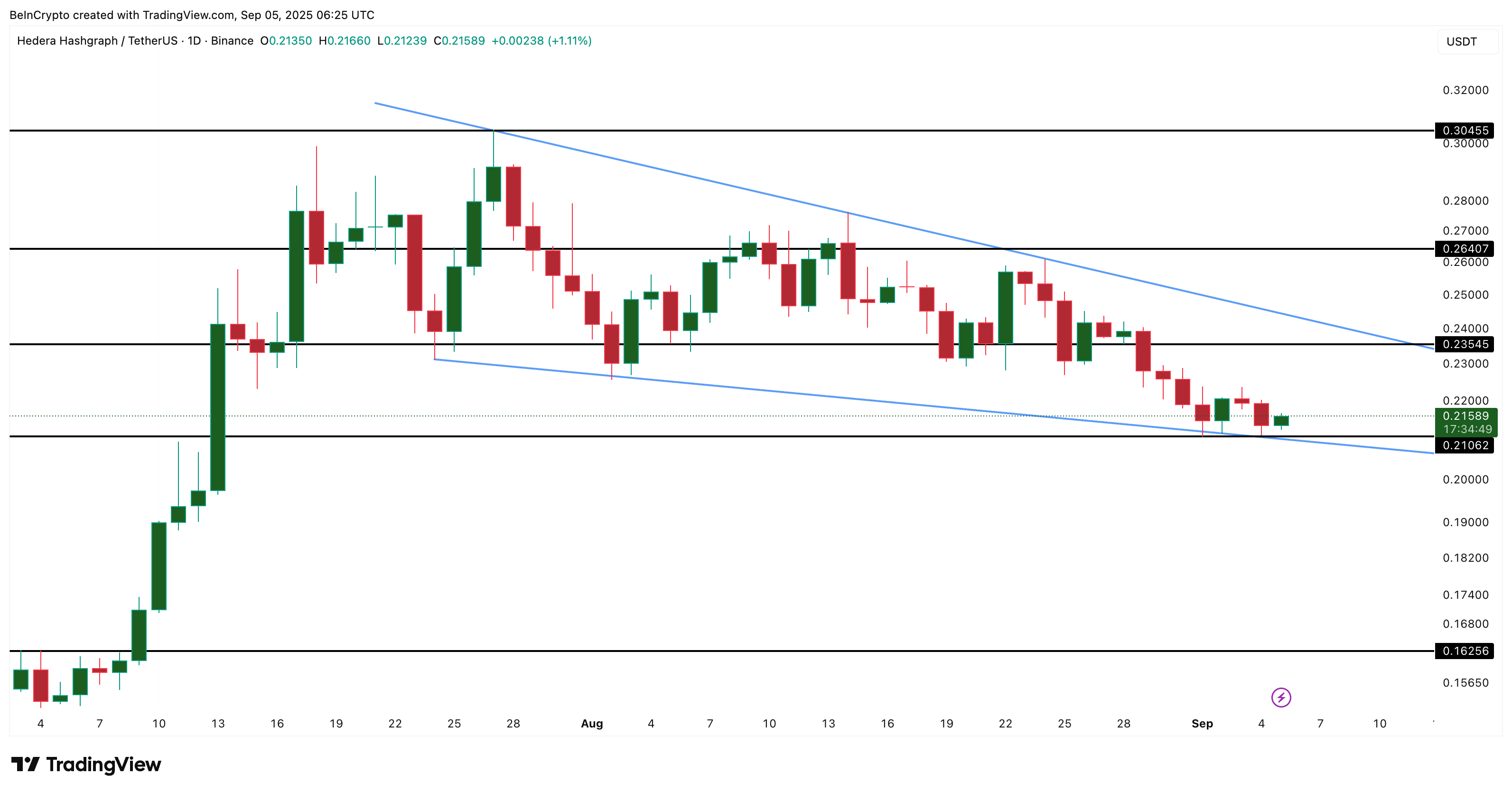 Shu vaqtgacha ayirboshlar nazoratda qolmoqda. Bir yillik o’sish tendensiyasi hali buzilmagan, ammo buqalar $0.210 ni himoya qilmasa va yuqori darajalarni qayta egallamasa, «HBAR» narxi ancha pastga tushish xavfi bor.