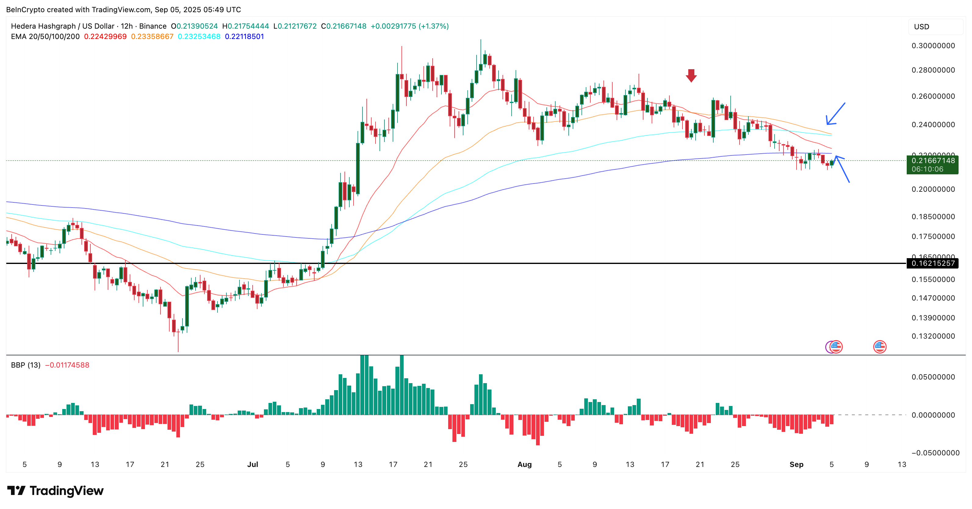 Agar ikkala chiziq pastga kesishsa, bu odatda qo’shimcha pasayishni bildiradi. 20-EMA 50-EMA ostiga tushgan 20-avgustdagi oxirgi kesishish «HBAR» narxini bir necha sessiyada $0.24 dan $0.22 gacha tushirdi.