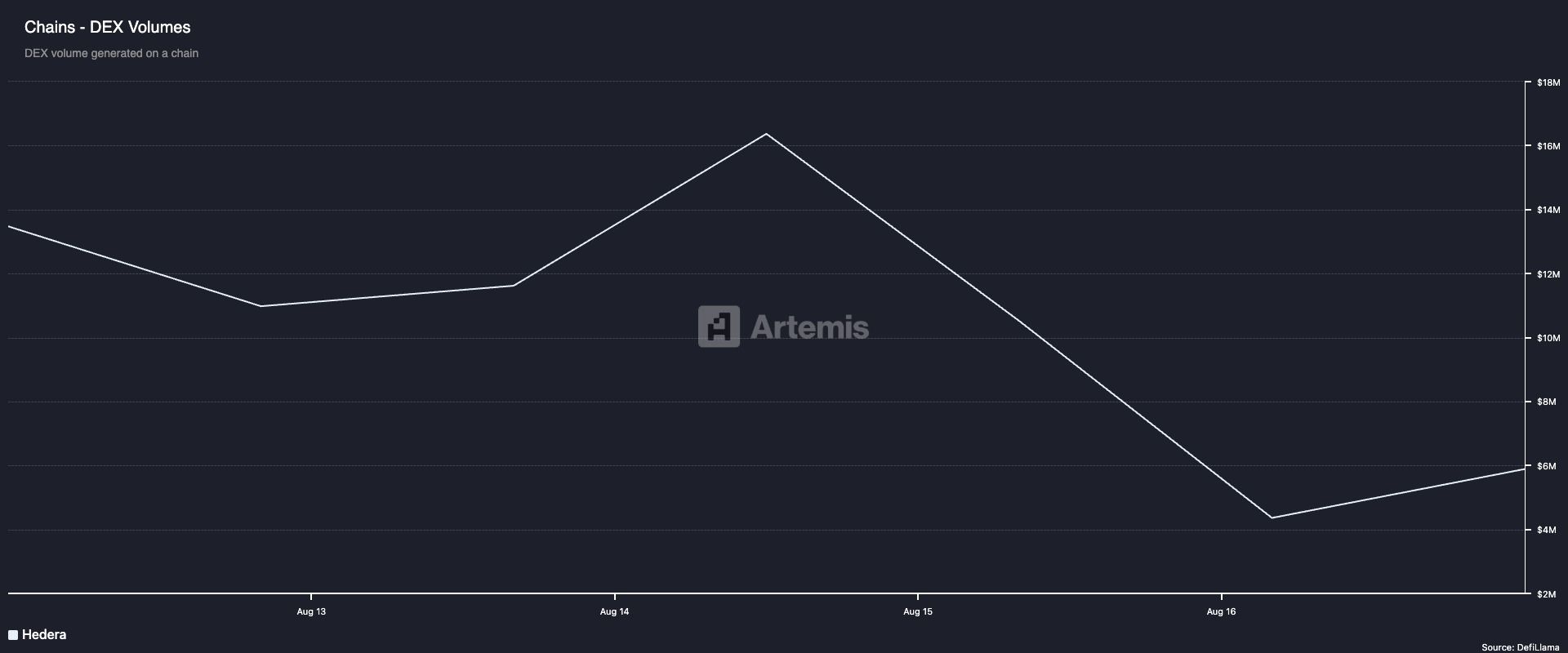 Bundan tashqari, «Hedera»dagi markazlashmagan birja (DEX) hajmlarining pasayishi tarmoqdagi foydalanuvchi faolligining pasayishini tasdiqlaydi. So’nggi haftada bu deyarli 60% ga kamaydi, «Artemis» ma’lumotlariga ko’ra.