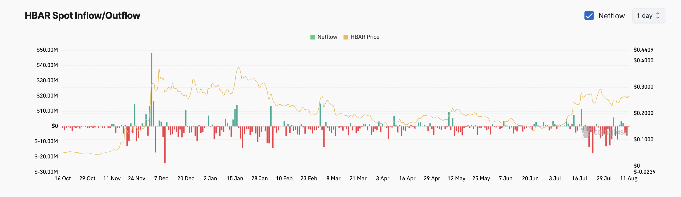 So’nggi uch kun ichida HBARning spot bozorlaridan kunlik chiqishlar token atrofidagi noaniqlikning o’sishini tasdiqlaydi, bu esa uning narxining barqaror holatda qolishiga sabab bo’ldi. Bu naqsh, shuningdek, bozor hissiyotidagi asta-sekin o’zgarishni aks ettiradi, chunki treyderlar o’z pozitsiyalaridan chiqishni ko’proq istaydilar.