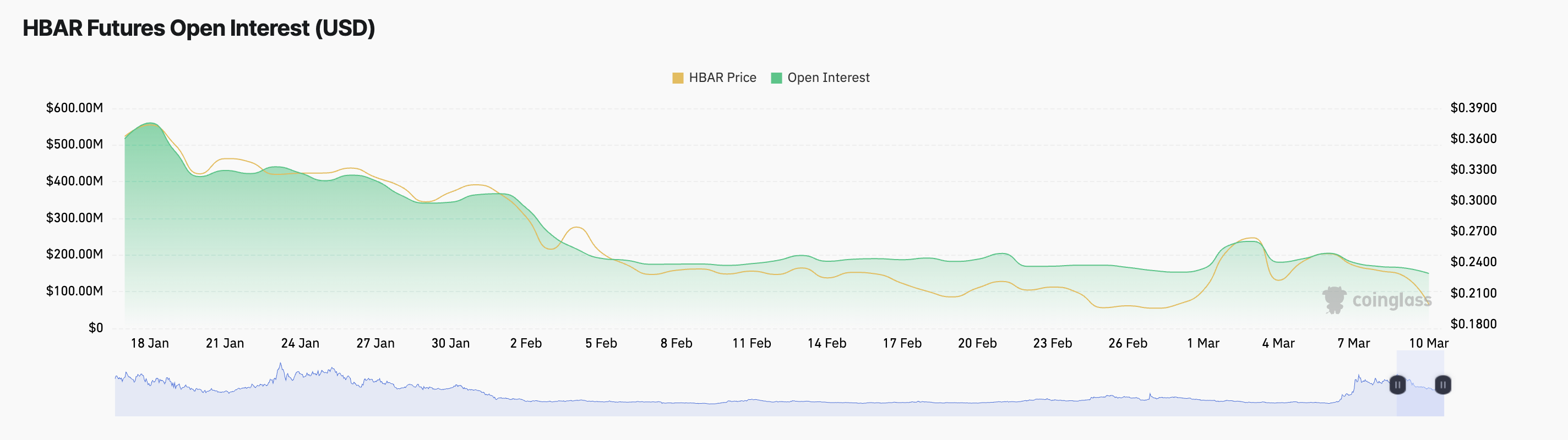 HBAR’ning ochiq foizlari, ya’ni hali hal qilinmagan fyuchers yoki opsionlar kabi umumiy derivativ kontraktlar soni, 9-yanvardan beri barqaror ravishda pasayib bormoqda. Faqatgina bu oyda u 8% ga tushib ketdi va hozirda $149 millionni tashkil etmoqda, bu yil boshidan beri eng past darajadir.