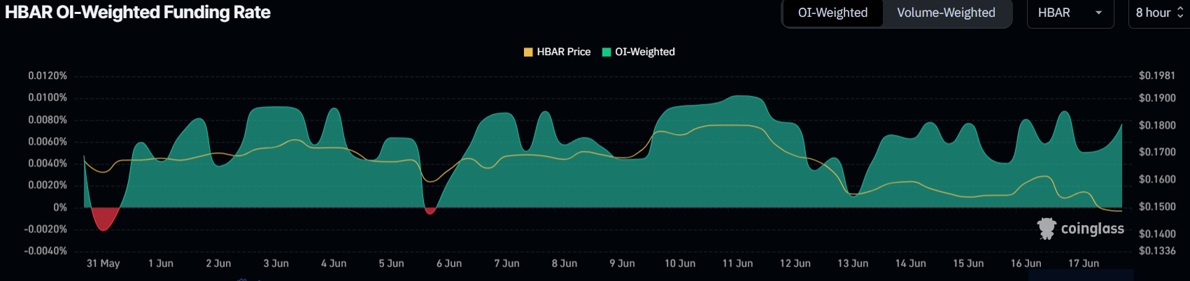 HBAR uchun moliyalashtirish darajasi umuman ijobiy bo’lib qoldi, faqat bir marta salbiy zonaga tushdi. Bu savdogarlar orasida ishonchning davom etayotganini ko’rsatadi. Ushbu barqaror optimistik hissiyot savdogarlarning HBAR tokeni oxir-oqibat tiklanishiga ishonch hosil qilganligini anglatadi.
