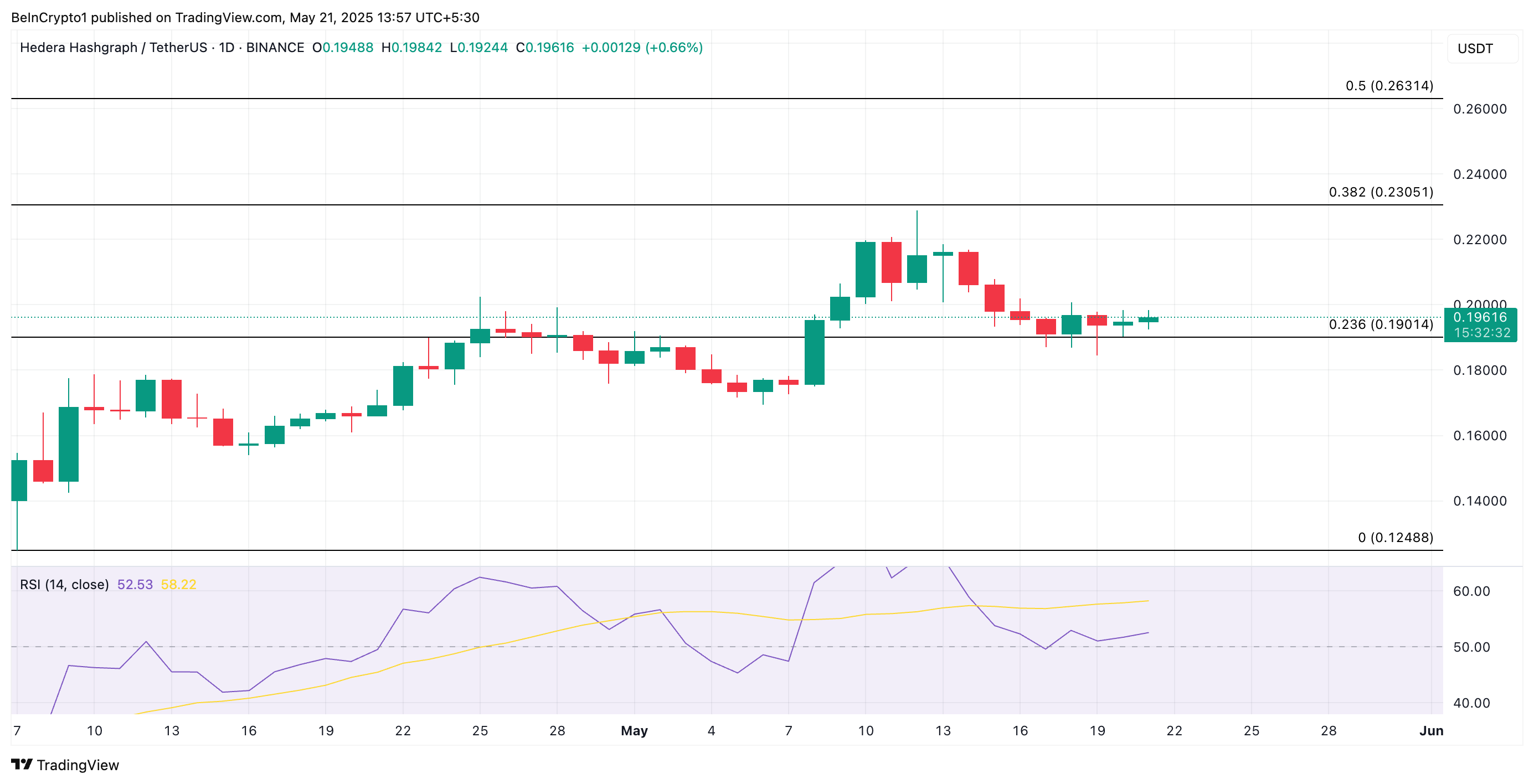 HBARning RSI ko’rsatkichi buqalarning bozor ustidan nazoratni asta-sekin qayta qo’lga kiritayotganini ko’rsatadi, bu esa uning qiymatini yaqin kelajakda oshirishi mumkin. Agar bu davom etsa, HBAR 0.20 dollar narx belgisidan yuqoriga chiqib, 0.23 dollarda savdo qilishi mumkin.