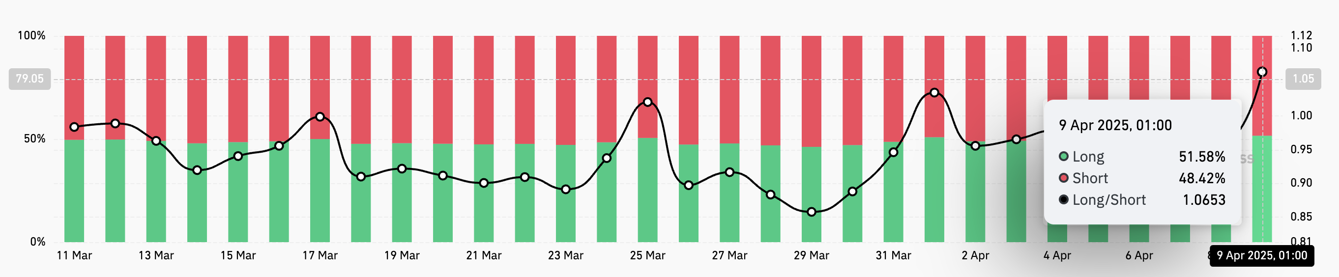 Long/Short nisbati bozoridagi long pozitsiyalar (narxning ko’tarilishiga tikilgan) va short pozitsiyalar (narxning pasayishiga tikilgan) o’rtasidagi nisbatni o’lchaydi. Agar nisbati birdan past bo’lsa, bu short pozitsiyalar long pozitsiyalardan ko’proq ekanligini anglatadi.