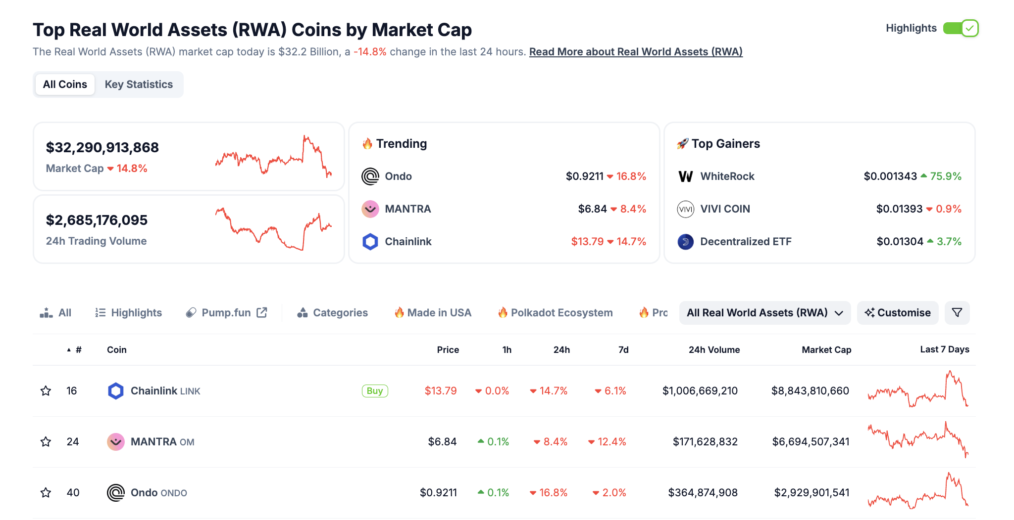 BeInCrypto ta’kidlaganidek, Real-World Asset Tokenization jismoniy yoki nomoddiy aktivlarni blokcheynda raqamli tokenlarga aylantirish jarayonini anglatadi. CoinGecko ma’lumotlariga ko’ra, matbuot vaqtida RWA bilan bog’liq loyihalarning bozor kapitalizatsiyasi 32 milliard dollardan oshadi.