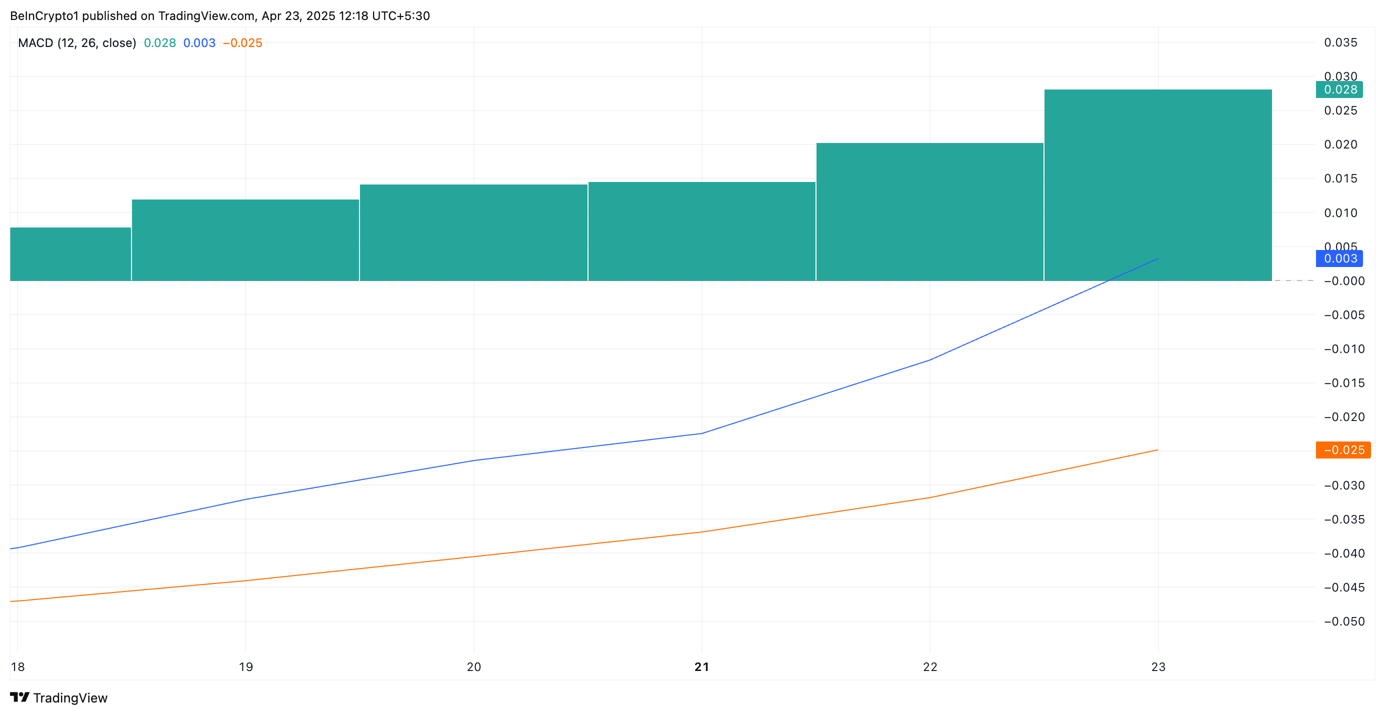 Bundan tashqari, tokenning Harakatlanuvchi O’rtacha Konvergentsiya Divergentsiyasi (MACD) ko’rsatkichlari ham ijobiy ko’rinishni qo’llab-quvvatlaydi. Hozirda MACD chizig’i (ko’k) signal (sariq) va nol chiziqlaridan yuqorida joylashgan.