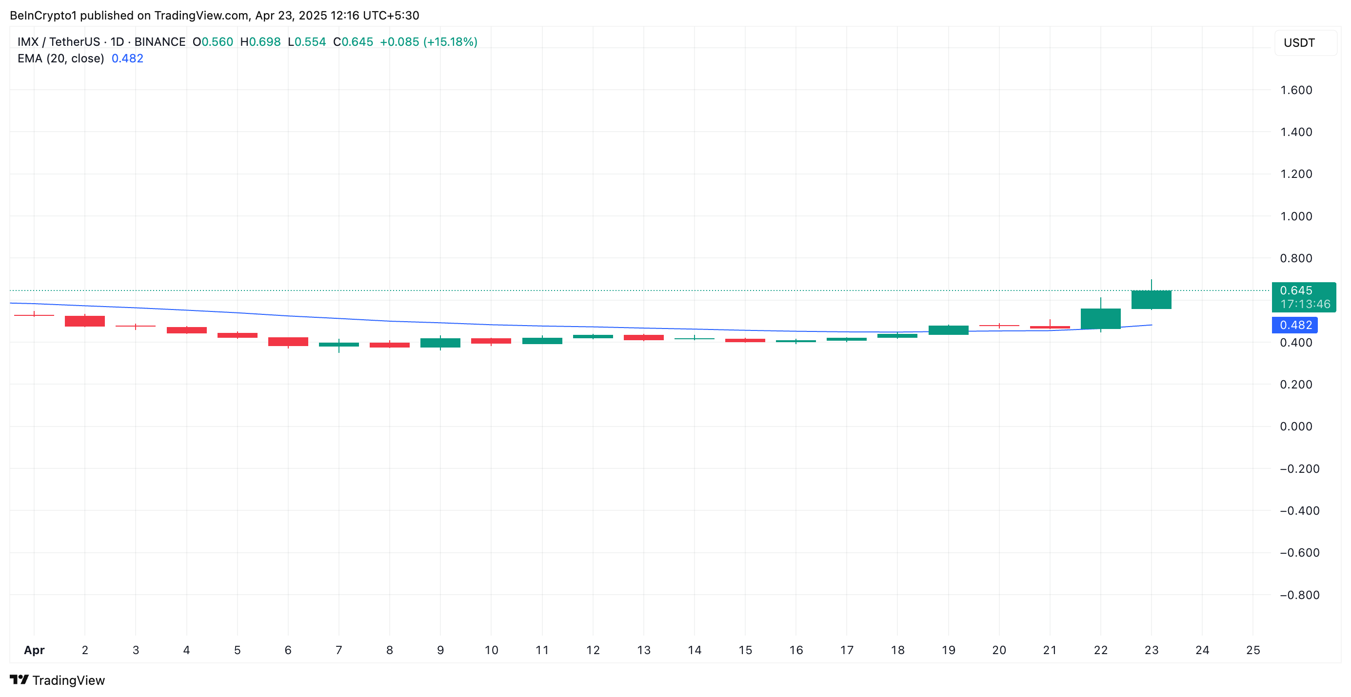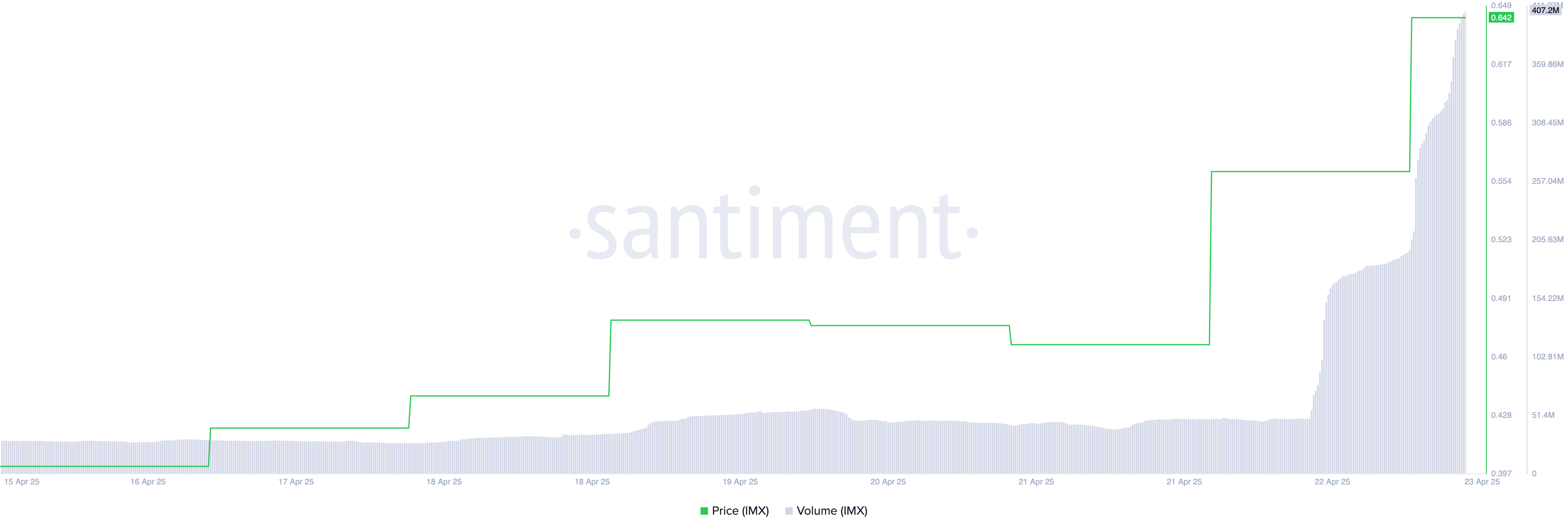IMX hozirda 27 kunlik eng yuqori narx – 0.65 dollarda savdo qilmoqda. So’nggi bir kunda uning narxi 41% ga oshdi. Shu davrda uning savdo hajmi 761% ga oshdi. Bu esa IMX savdo faoliyatining o’sishini tasdiqlaydi.