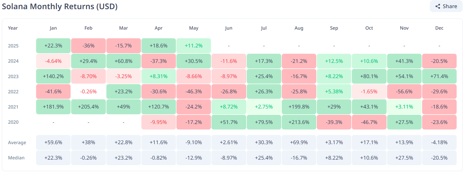 May oyining boshida Solana (SOL) kuchli o’sish ko’rsatdi, lekin oy davomida bu kuchini yo’qotdi va natijada narx barqarorlashdi. Solana narxi dastlab yuqori nuqtaga yetgach, tor doirada o’zgarib turdi.