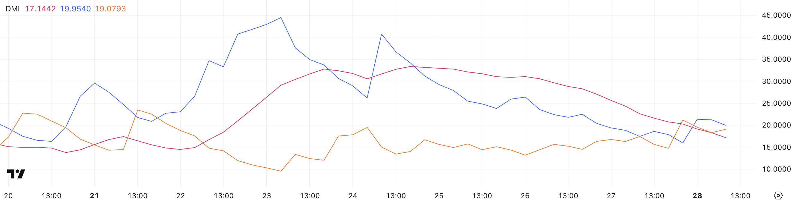 Bu keskin pasayish ADAning so’nggi tendensiyasining kuchi sezilarli darajada zaiflashganini bildiradi. Shu bilan birga, +DI (ijobiy yo’nalish ko’rsatkichi) hozirda 19.95 da, bir necha soat oldin 15.96 edi, lekin ikki kun oldin 26 dan pastda.