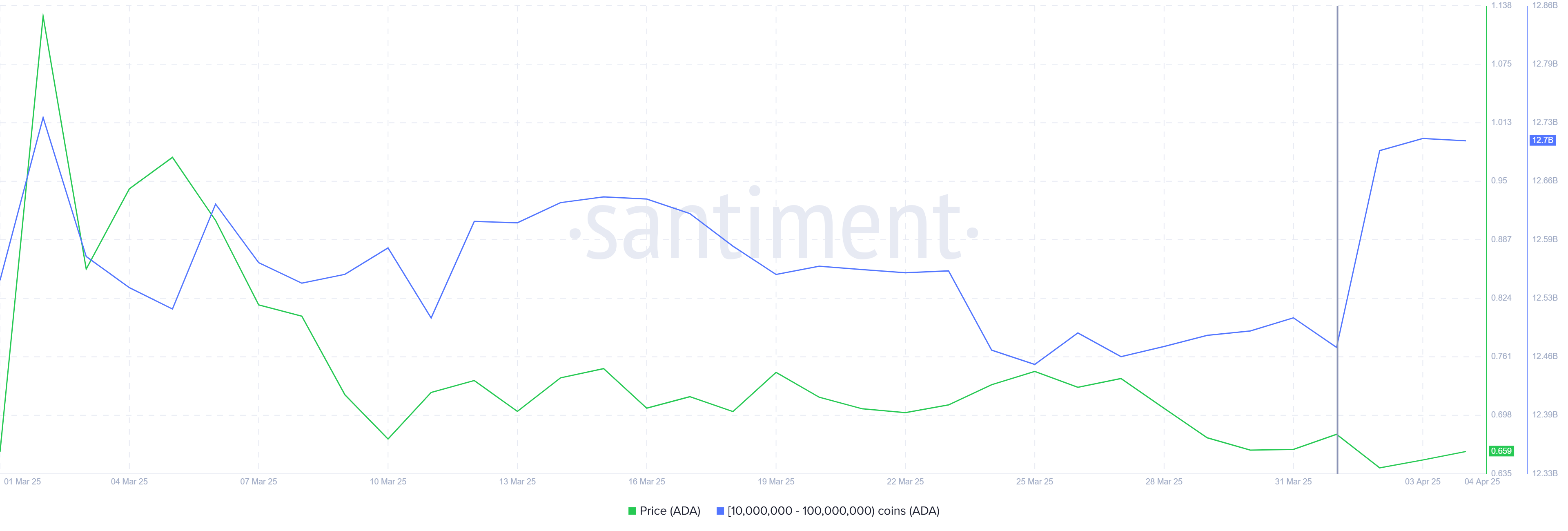 So’nggi 72 soat ichida 10 milliondan 100 milliongacha ADA saqlagan kitlar 230 milliondan ortiq ADA to’pladi, bu hozirgi narxlarda 150 million dollardan ortiq qiymatga ega. Sotish va neytral bo’lishdan to’plashga o’tish kayfiyatning o’zgarishini ko’rsatadi, kitlar ADAning 2025 yilning 2-choragidagi potentsiali haqida optimistik. Ularning so’nggi faoliyati altkoinning tiklanishiga ishonchni ko’rsatadi, garchi so’nggi bozor qiyinchiliklariga qaramay.