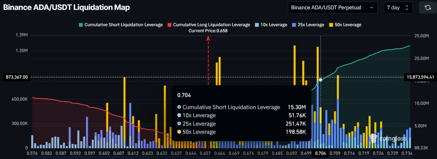 Cardano uchun likvidatsiya xaritasi shuni ko’rsatadiki, ADA $0.70 darajasidan yuqoriga ko’tarilishi bilanoq taxminan 15 million dollarlik qisqa muddatli shartnomalar muddati tugaydi. Bu altkoin uchun muhim imkoniyatni taqdim etadi. Qisqa sotuvchilar o’z pozitsiyalarini yopishga majbur bo’lishi mumkin, bu esa qisqa siqilishga olib kelishi va narxni oshirishi mumkin.