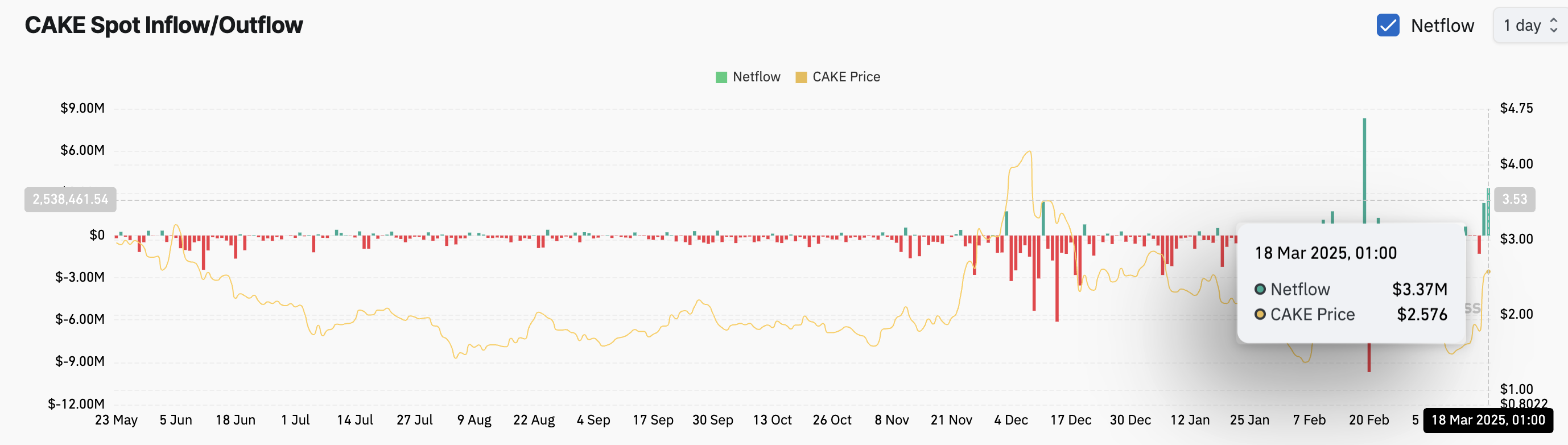 Ushbu o’sish CAKE tokeniga bo’lgan kuchli talab va investorlarning yangilangan qiziqishi tufayli bir oy ichida eng yuqori kunlik spot kirimlarini qayd etishi bilan sodir bo’lmoqda.
