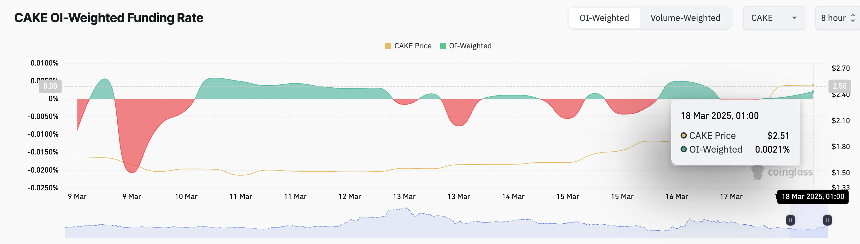 Moliyalashtirish darajasi doimiy fyuchers shartnomalarida uzoq va qisqa treyderlar o’rtasida almashinadigan davriy to’lov bo’lib, shartnoma narxini spot bozor bilan moslashtirish uchun ishlatiladi. Ijobiy moliyalashtirish darajasi uzoq treyderlar qisqa treyderlarga to’layotganini anglatadi, bu esa CAKE uchun kuchli talab va ijobiy bozor kayfiyatini ko’rsatadi.