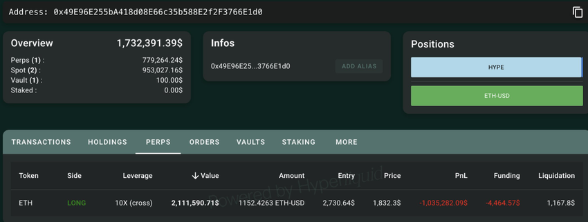 Biroq, PEPE kitidan farqli o’laroq, bu treyderda $1,167.8 likvidatsiya narxi bilan yanada qulay marja buferi mavjud.
