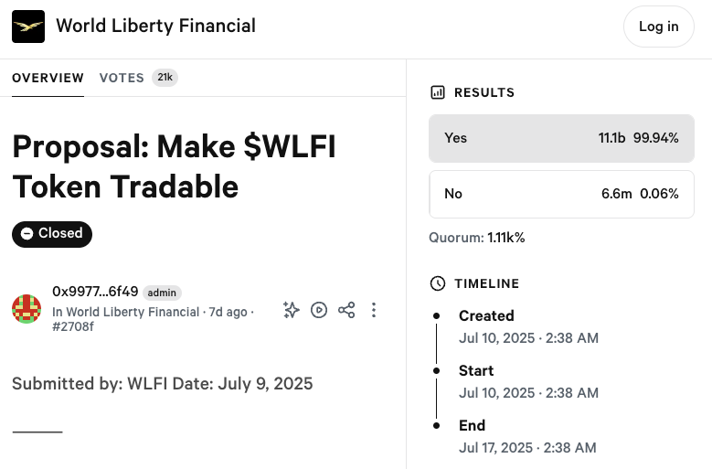 Prezident Tramp tomonidan qo’llab-quvvatlangan «World Liberty Financial» (moliyaviy tashkilot) ning WLFI tokenlari ovozi yakunlanganidan so’ng ommaviy savdoga ochiladi, bu esa akkreditatsiyadan o’tgan investorlar doirasidan tashqariga chiqishni kengaytiradi. Efirium asosidagi markazlashmagan moliyaviy loyiha kripto qarz olish va berish xizmatlarini taklif qilishni rejalashtirmoqda, ammo uning platformasi hali ishga tushirilmagan.