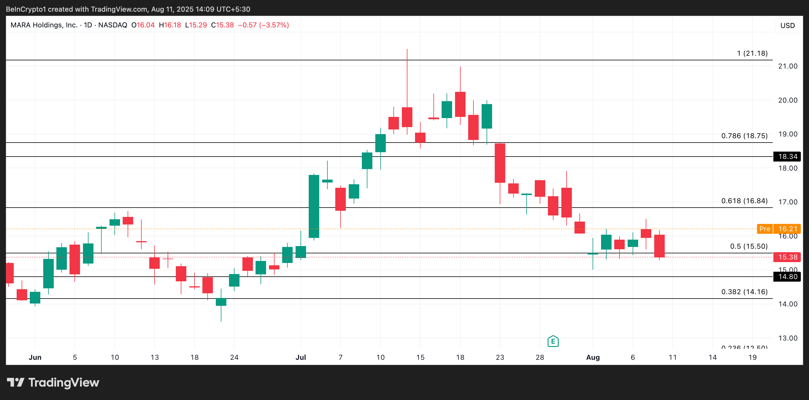 Juma kunidagi savdo sessiyasida MARA $15.38 da yopildi, 3.39% ga pasaydi. Biroq, hissiyot yaxshilangan ko’rinadi. Bugun bozor oldi savdosida aksiyalar $16.21 ga ko’tarildi. Agar sotib olish harakati davom etsa, MARA ning narxi $16.84 ga ko’tarilishi mumkin.