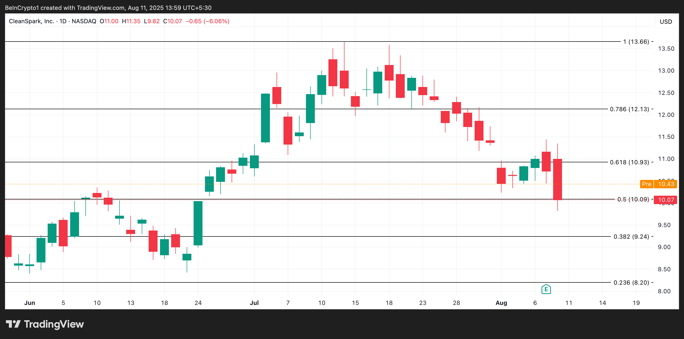 «CleanSpark» kompaniyasi (kompaniya) bu hafta kuzatish kerak bo’lgan kripto aksiyalardan biri. Uning aksiyalari juma kuni 6% ga pasayib, $10.07 da yopildi. Bu pasayish kompaniyaning 2025 yil 30 iyunda tugagan chorak uchun 7 avgustda e’lon qilingan kuchli moliyaviy natijalariga qaramay sodir bo’ldi.