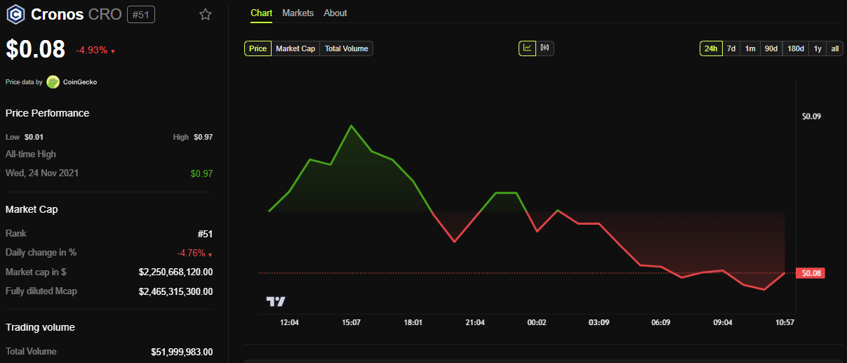 Ushbu norozilik fonida, Cronos’ning CRO narxi deyarli 5% ga pasaydi. BeInCrypto ma’lumotlariga ko’ra, ushbu yozuv paytida CRO $0.08 ga savdo qilinmoqda.