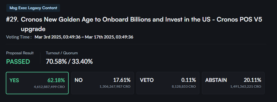 Bu yakshanba kuni 14:00 UTC da 3,35 milliard CRO tokenlarining to’satdan kirib kelishi bilan o’zgardi. Bu zarur kvorumni ta’minladi va “ha” ovozlarini sezilarli darajada oshirdi. E’tiborlisi, ovoz berish ishtiroki 70,58% ni tashkil etdi, bu talab qilingan chegaradan oshib ketdi. Yakuniy natija 62,18% foyda, 17,61% qarshi va 20,11% betaraf bo’ldi.