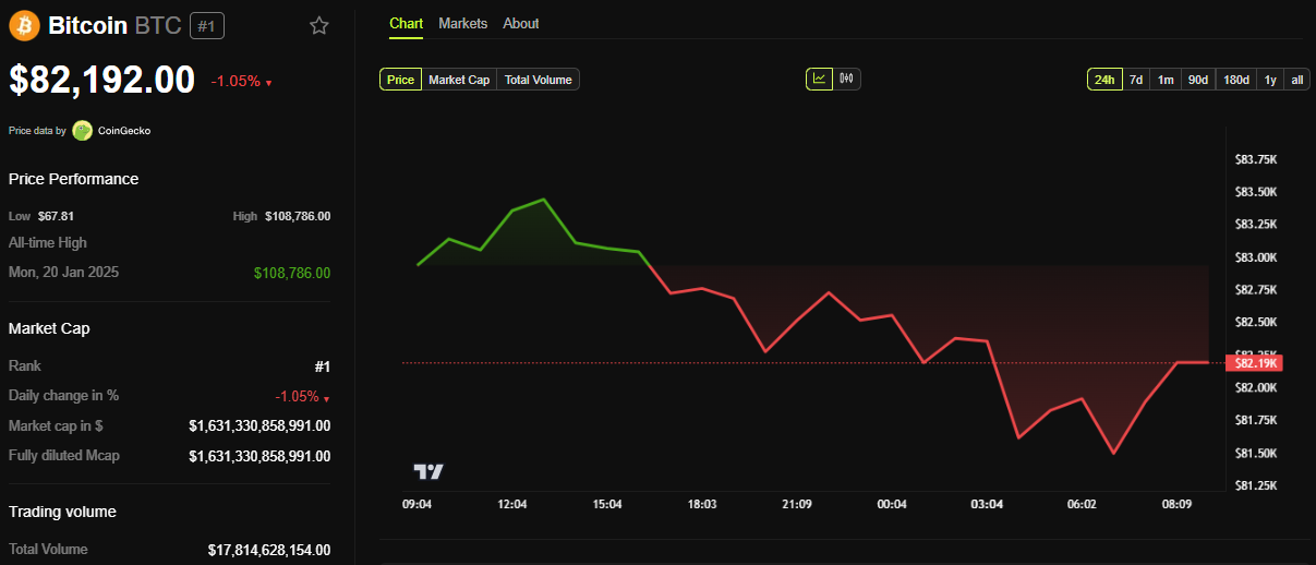 BeInCrypto ma’lumotlariga ko’ra, BTC ushbu yozuv paytida $82,192 ga savdo qilinmoqda, so’nggi 24 soat ichida 1% dan ko’proq pasaygan.