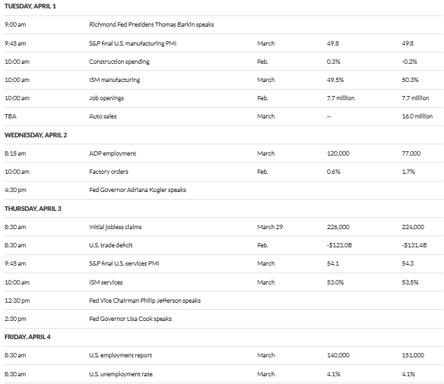 Haftaning eng muhim voqeasi juma, 4-aprel kuni AQShning Ish bilan ta’minlash hisobotining e’lon qilinishi bilan boshlanadi, bu hisobot keng miqyosda Non-Farm Payrolls nomi bilan tanilgan. Bu keng qamrovli mehnat bozori yangilanishi, jumladan qo’shilgan ish o’rinlari, ishsizlik darajasi va ish haqi o’sishi, butun dunyo bozorlarining asosiy ko’rsatkichidir.
